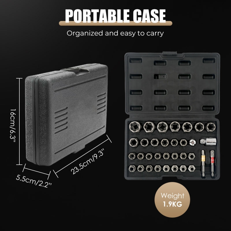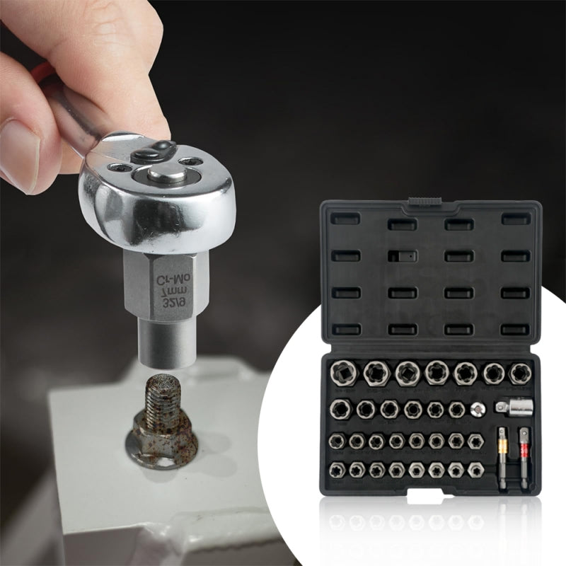 Förpackningen innehåller: 1 × 33-delars hylsnyckelsats för borttagning av muttrar