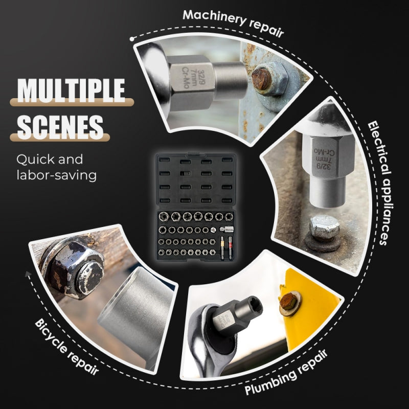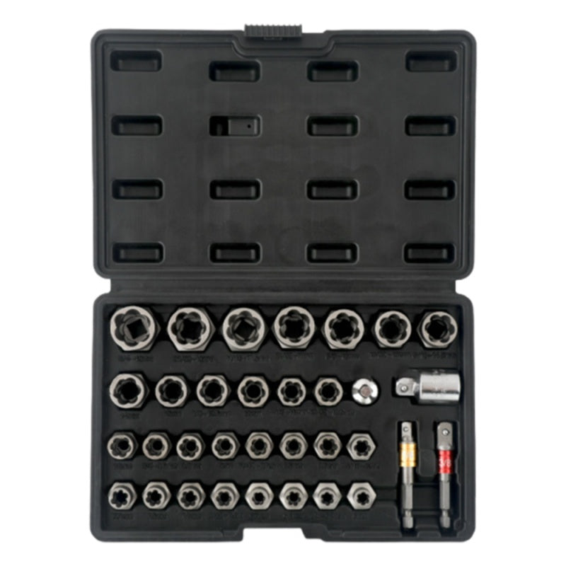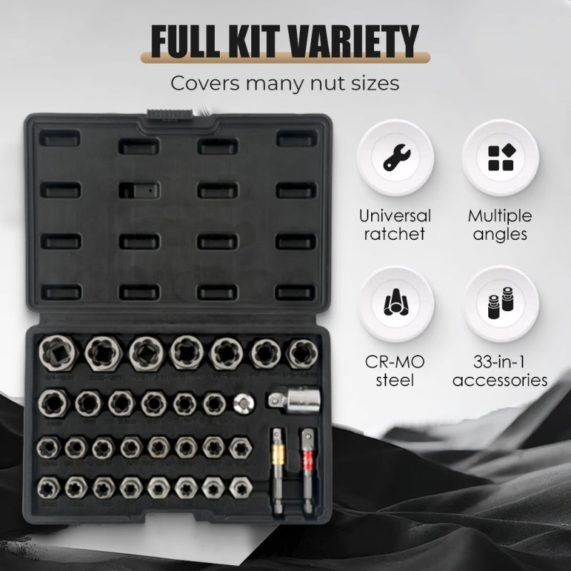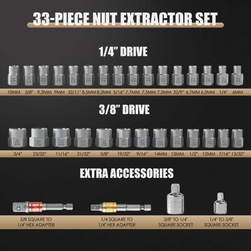 OMFATTANDE 33-DELS KIT: Innehåller 13 st 3/8'' mutterutdragarhylsor (27 mm), 16 st 1/4'' utdragarhylsor (27 mm), två adaptrar (3/8'' till 1/4'', 1/2'' till 3/8''), plus två 65 mm förlängningsstänger – vilket enkelt uppfyller olika reparationsbehov.