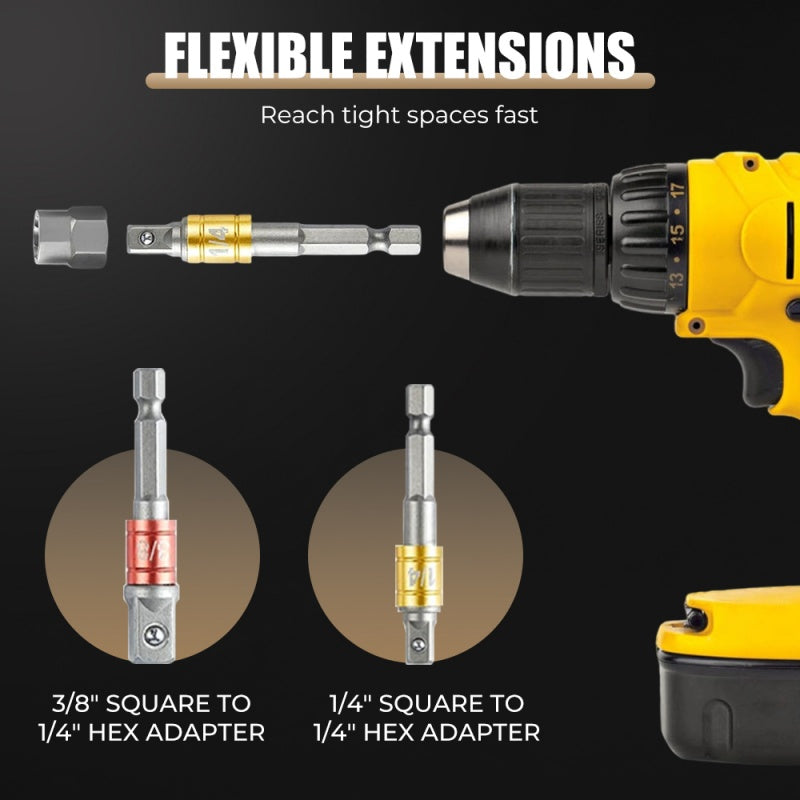 MÅNGSIDIG KOMPATIBILITET: Adaptrarna och förlängningsstavarna gör det lätt att nå trånga utrymmen och fungerar med ett brett utbud av spärrskaft, skiftnycklar och elverktyg – verkligen mångsidig användning.