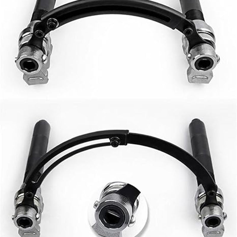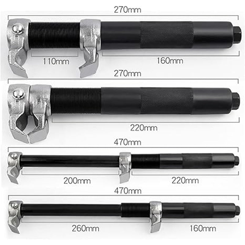 SKYDDSSKENA OCH TYNGRE GÄNGD: Kompressorsatsen för spiralfjädrar har en skyddsskena för att säkerställa en jämn och balanserad kompression. Den tjockare gängan minskar risken för att den glider, vilket ger ett säkrare och tryggare verktyg för fjädringsreparationer.
