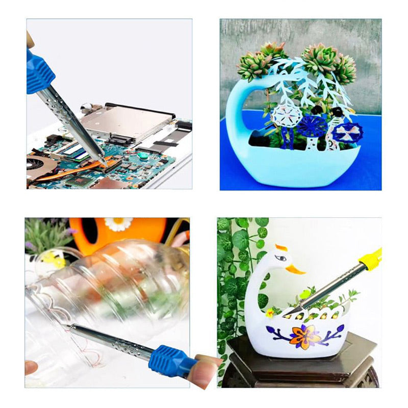 LÖDKOLV GRAVYRSET - Satsen innehåller: 5 utbytbara blad, 1 skruvmejsel, 2 chuckar och 1 kontakt med olika specifikationer. Denna lätta lödningssats för elektroniska produkter är bärbar, lätt att använda eller bära, bara plug and play-användning.