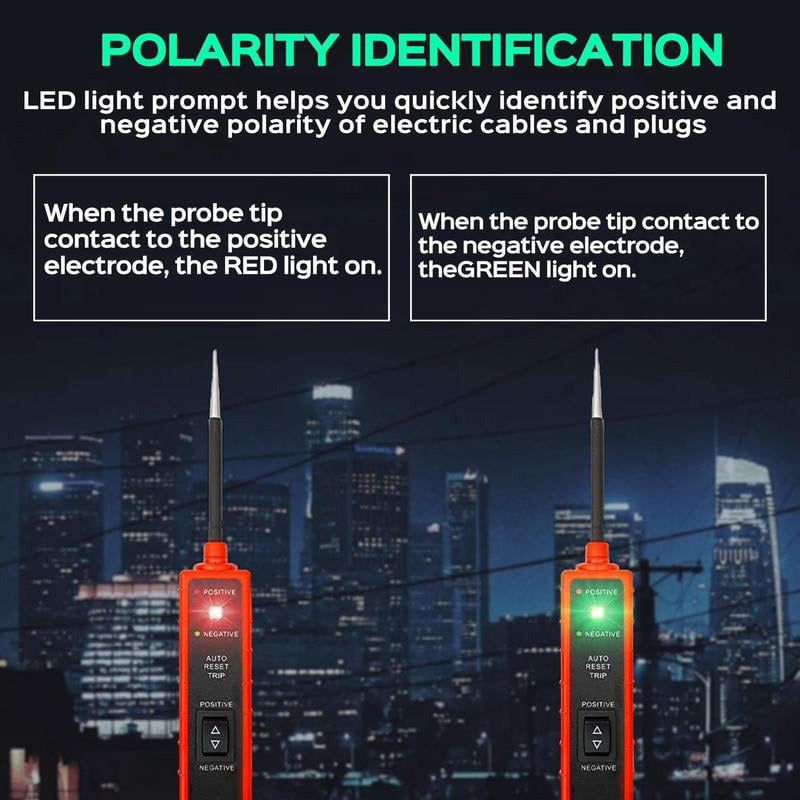 POLARITETSTEST - Denna kretsprovare identifierar snabbt kabelpolariteten. LED-indikatorn visar rött för positiva och grönt för negativa poler, vilket gör det enkelt att kontrollera anslutningar och säkerställa korrekt kabeldragning i ditt fordon.