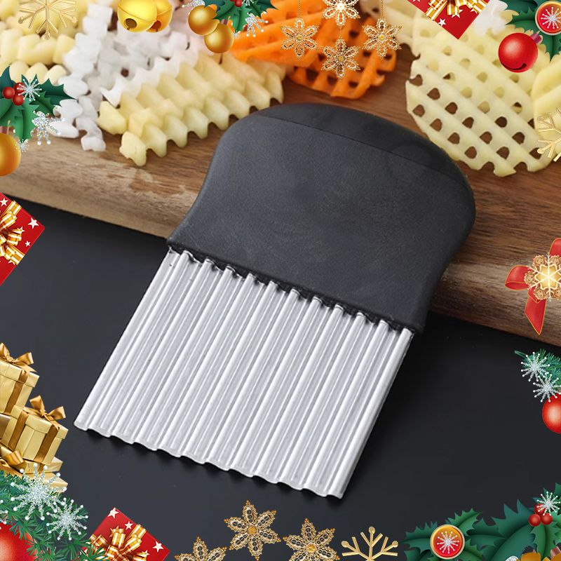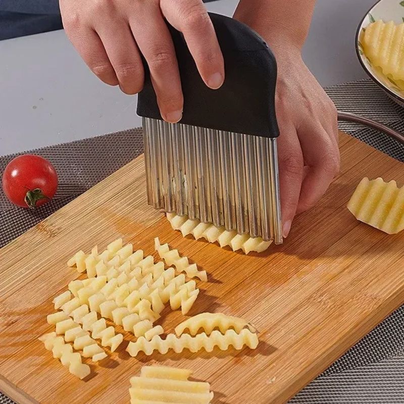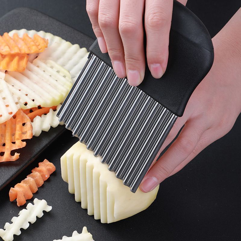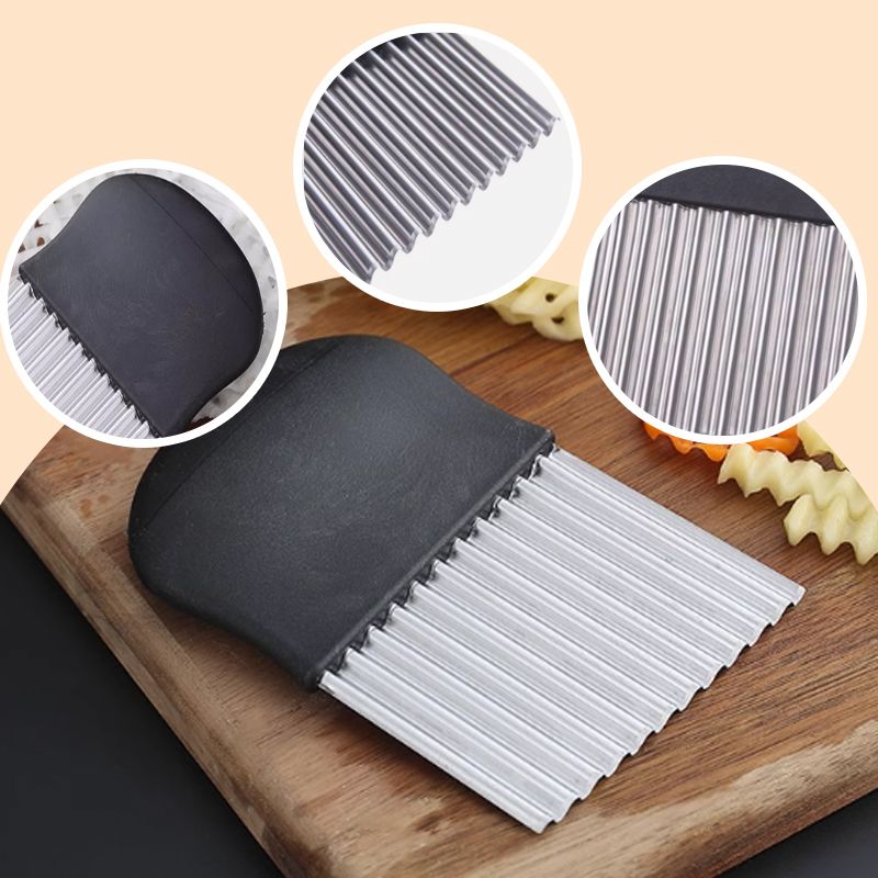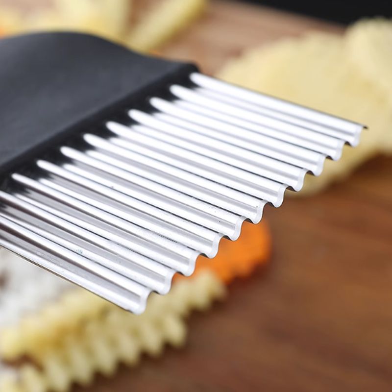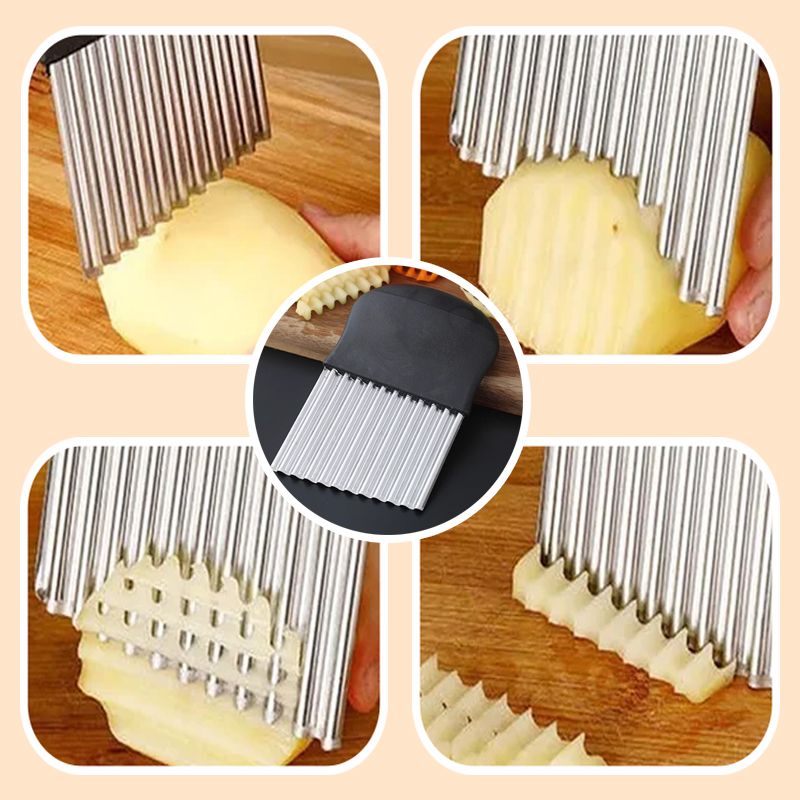 MÅNGA ANVÄNDNINGSOMRÅDEN: Den räfflade potatiskniven i rostfritt stål är inte begränsad till att skära potatis, utan kan enkelt skära andra grönsaker som gurka, morötter och mycket annat. Denna mångsidighet gör den till ett värdefullt tillskott i alla kök, oavsett om du är en professionell kock eller en hemmakock.