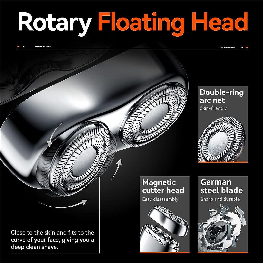 Skarpt virvelblad i rostfritt stål, specialiserat på hårt skägg, 0,1 mm tunn folie i rostfritt stål, dubbelring 3D-knivnät, ökar rakningsvolymen, flytande bågyta slät och tar bort hår från huden.