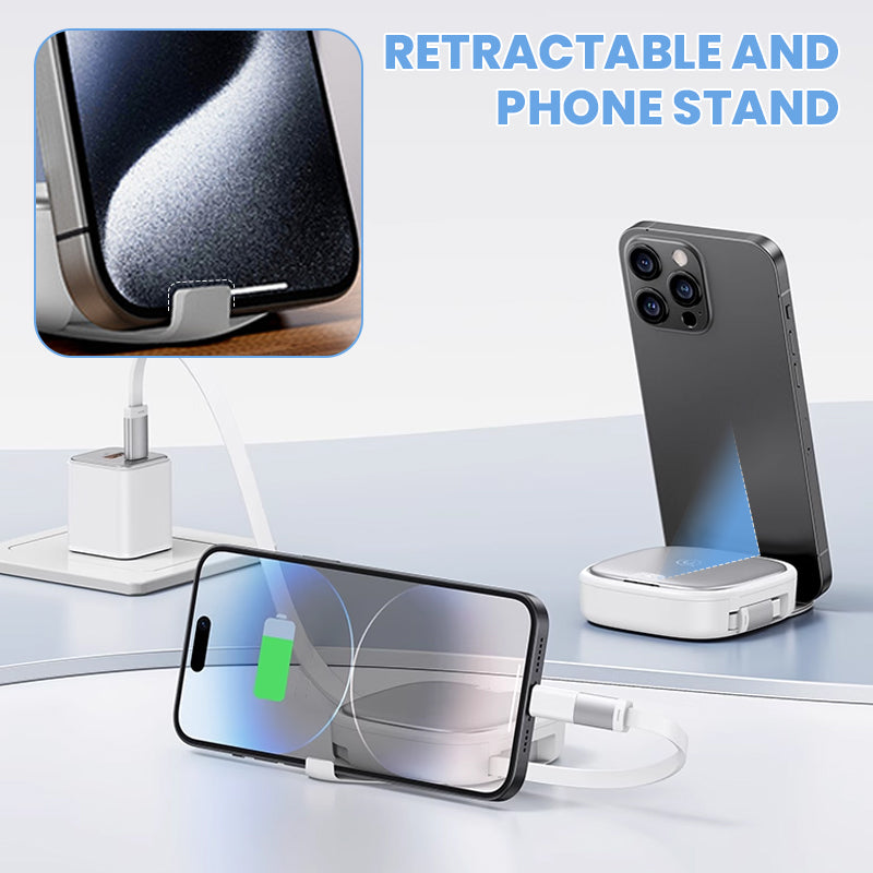 INFÄLLBAR OCH TELEFONSTÅNG: Den infällbara kabeln har ett integrerat telefonstativ, så att du kan titta på videor handsfree medan du laddar. Stativet är inbyggt på baksidan av laddningsboxen för extra bekvämlighet.