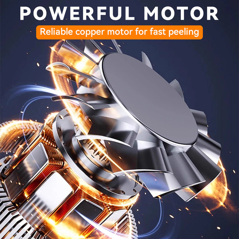 KRAFTFULL KOPPARTRÅDSMOTOR – Denna elektriska skalare är utrustad med en högpresterande koppartrådsmotor som garanterar effektiv och snabb skalning av olika frukter och grönsaker. Motorn levererar jämn kraft, vilket gör att även små frukter kan skalas utan ansträngning, utan att motorn stannar eller tappar prestanda. Dess hållbarhet och tillförlitlighet gör den till ett tidsbesparande tillskott i alla kök.