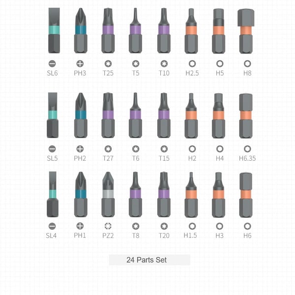 đ 24 skruvmejselbitar av industrikvalitet S2 krom-molybdenlegerat stĂ„l, kontinuerlig vĂ€rmebehandling. 5 typer av skruvmejselhuvuden, för att möta behoven för professionell anvĂ€ndning, hemliv, arbete, gör-det-sjĂ€lv och underhĂ„ll. Arbetsbesparande 6,2-graders spĂ€rrdesign, 58-tands positiv och negativ rotation spĂ€rrstruktur, spara 80 % anstrĂ€ngning.đšâđ§