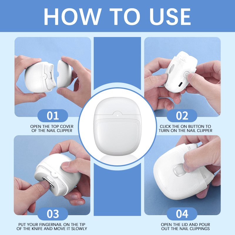 - [Förvaring av nagelrester och enkel rengöring] Nagelrester frÄn nagelklippning samlas i produktens förvaringslÄda. Genom att trycka pÄ den övre delen av fönstret kan du enkelt öppna och dumpa nagelklippet för snabb och enkel rengöring.