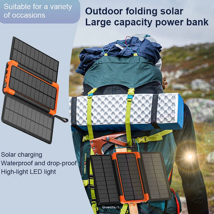 BYGGD FÖR UTOMHUS: Ta dina utomhusäventyr till nästa nivå med denna hållbara bärbara solarladdare. Dess robusta konstruktion är damm- och stöttålig, och den vikbara designen gör det enkelt att fästa den på din ryggsäck eller packa den i din väska.