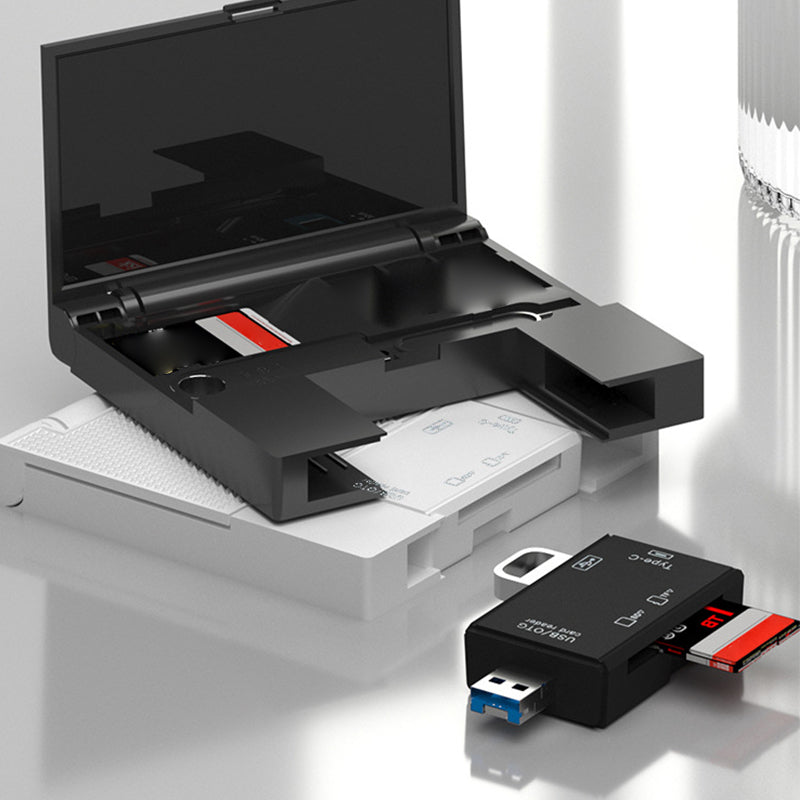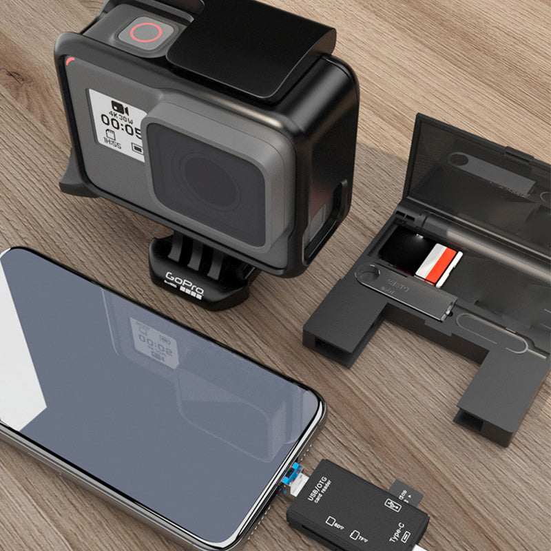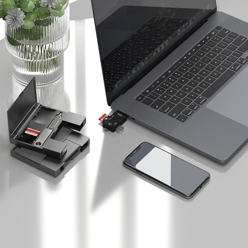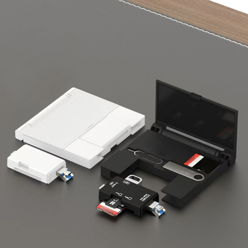 Praktisk förvaringslåda: Denna 7-i-1-kortläsare levereras med en integrerad förvaringslåda för att organisera och förvara dina minneskort, TF-kort, SIM-kort och andra små tillbehör, så att allt hålls prydligt på ett ställe.